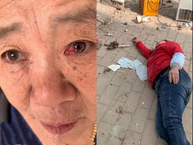图:女房主冯克华老人眼睛被打伤,躺在废墟前痛不欲生
