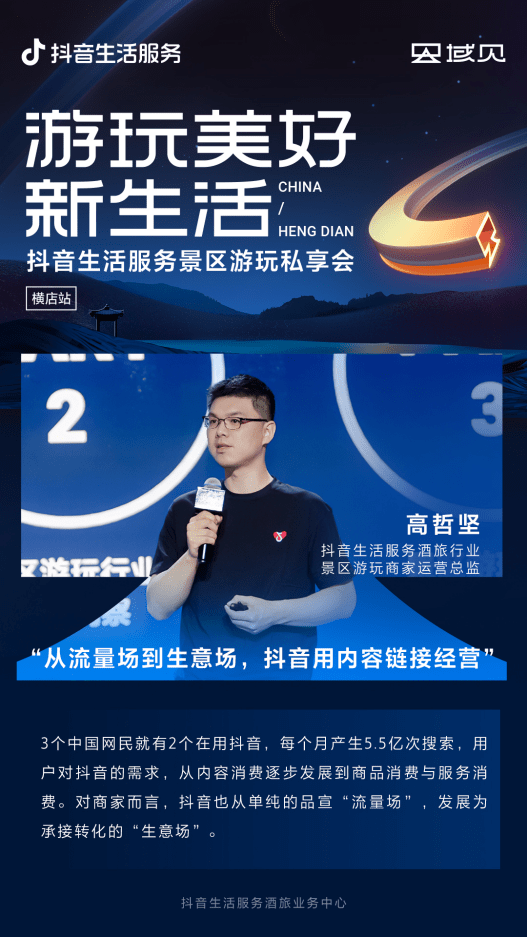 在用户需求与商家经营需求的双向奔赴之下,本地生活服务应运而生。2023年酒旅业务高速增长,抖音生活服务酒旅行业景区游玩业务负责人武永杰认为,景区游玩场景与抖音生活服务天然契合。景区本身是一个巨大的“宣传场”,来到这里的用户流连忘返,抖音助力景区游玩品效合一,在线上构建内容和交易场景,实现相互成就。