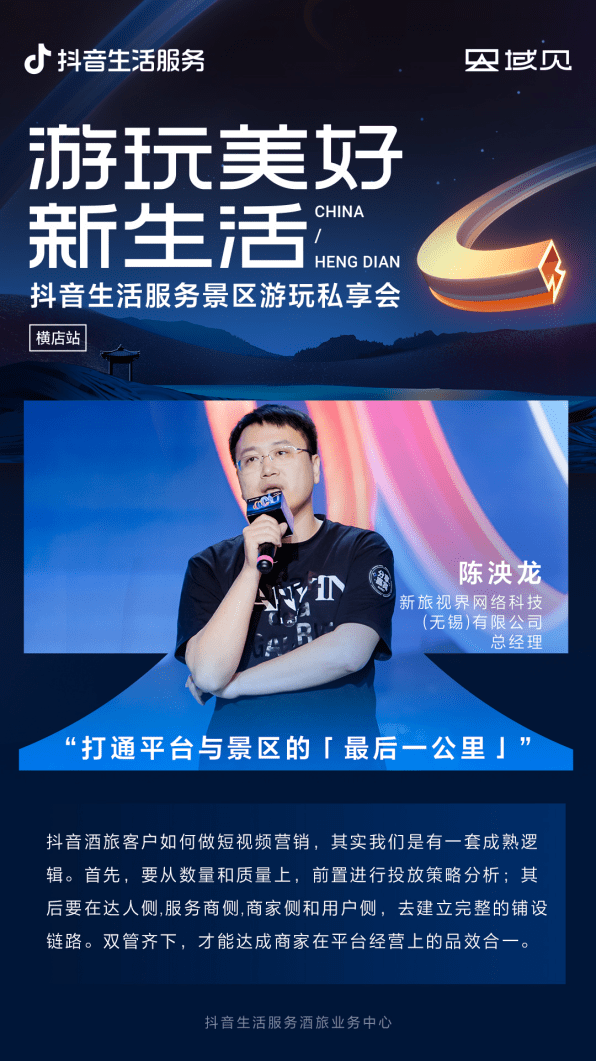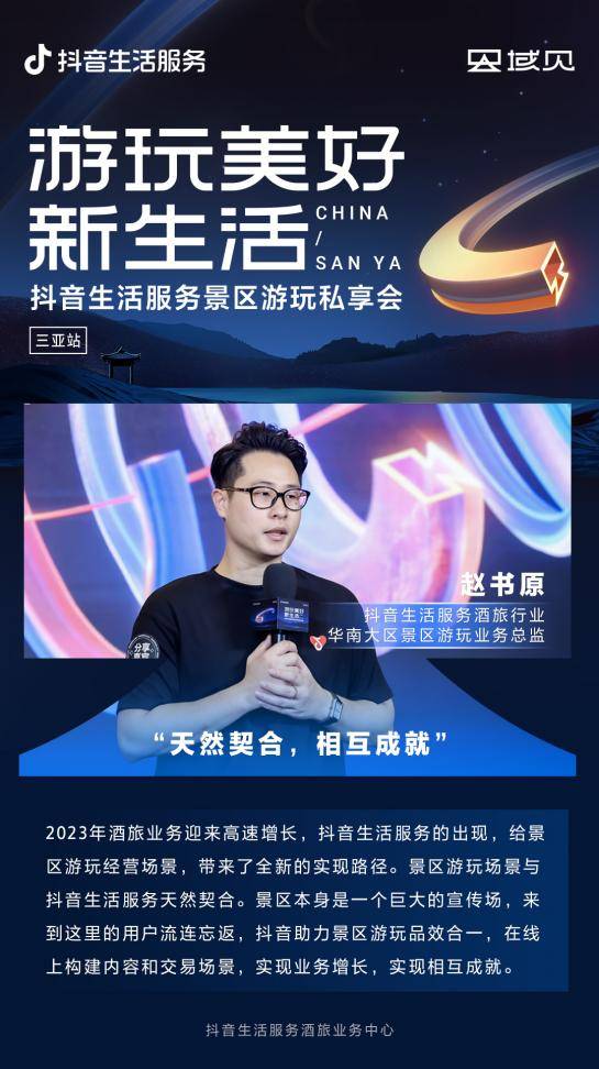 随着酒旅行业的模式变迁,如何把握消费需求增长给酒旅市场带来的新机遇?广大商旅企业亟需探索新思路、找准新方法。4月中旬到5月底,2023游玩美好新生活抖音生活服务景区游玩私享会以「域见·游玩美好新生活」为主题,走进成都、横店、北京、三亚四城,抖音生活服务携手酒旅生态中的合作伙伴分享景区游玩新趋势及优秀案例,共同见证文旅行业新开局,探讨业务经营与抖音本地生活的深度融合发展,助力酒旅企业探寻增长新路径。